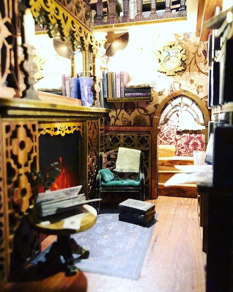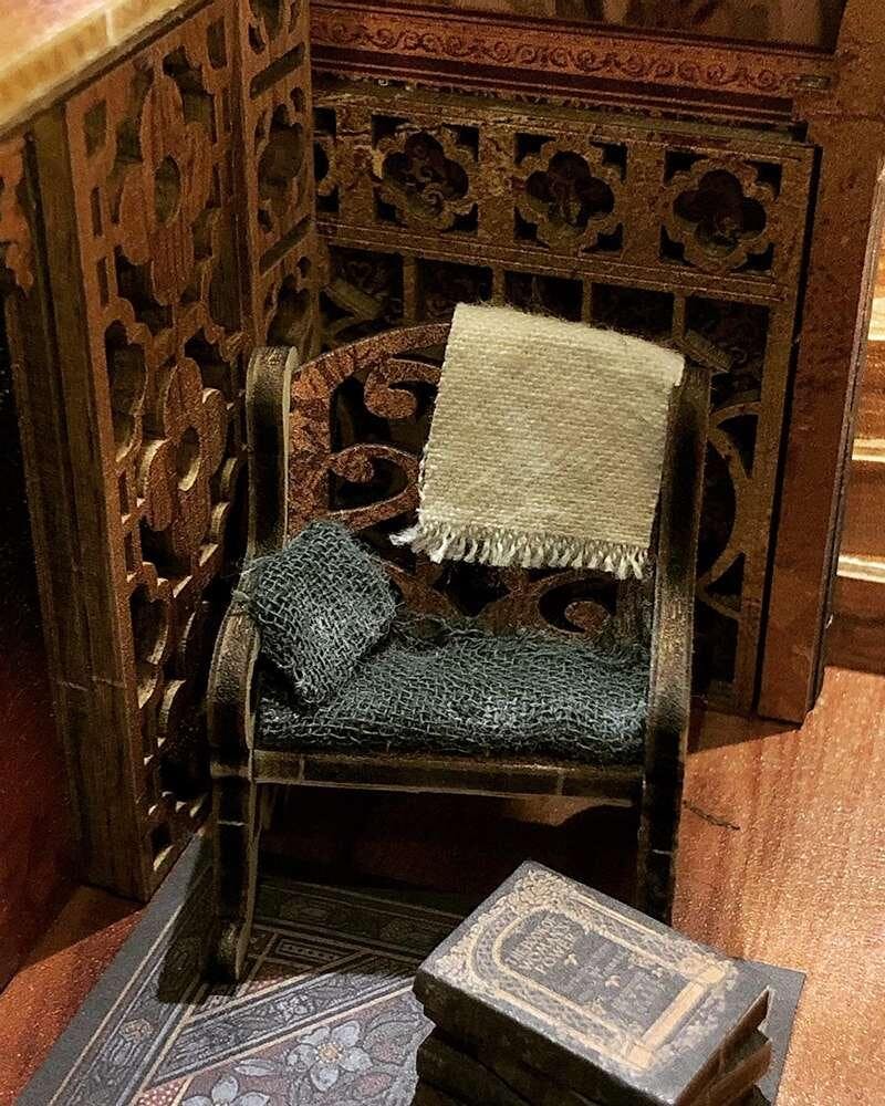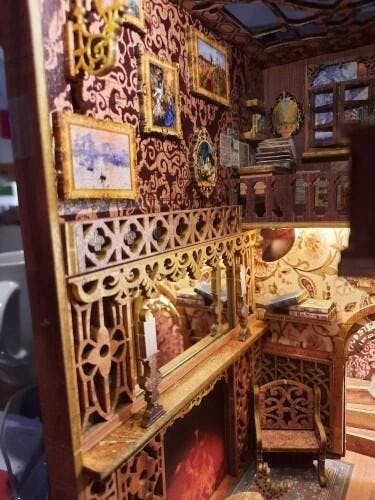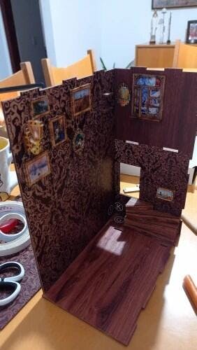 Me gustó el aspecto general del kit, pero creo que podría beneficiarse de algunos reemplazos en 3D para los elementos planos: la lámpara de carruaje (con LED intermitente), el reloj de arena, el perro (sustituido por 2 gatos), algunos libros adicionales —un diccionario grande y una Biblia—, una alfombra real, un candelabro de vidrio manchado, una lámpara de techo central, flores y un cojín de terciopelo para la silla con un gato sentado en ella. ¡Me divertí muchísimo armando el Book Nook!
