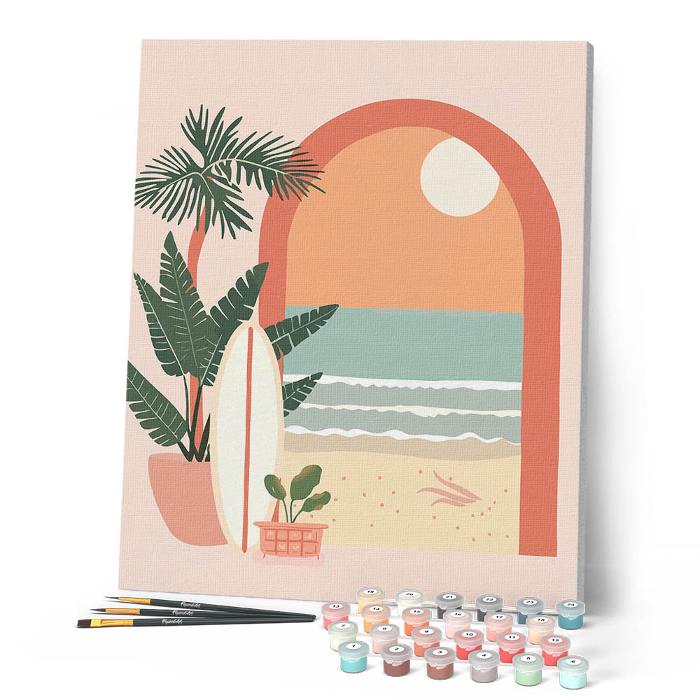 2) Recibirá un kit listo para usar que contiene el lienzo con las áreas numeradas, los potes de pinturas numeradas, pinceles y una imagen del resultado esperado para usar de guía. ¡Que comience el viaje!