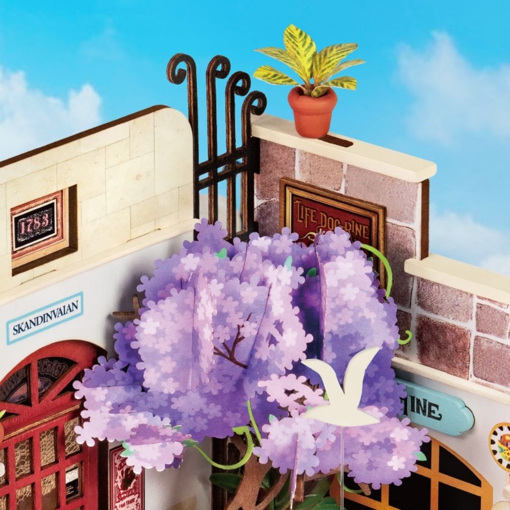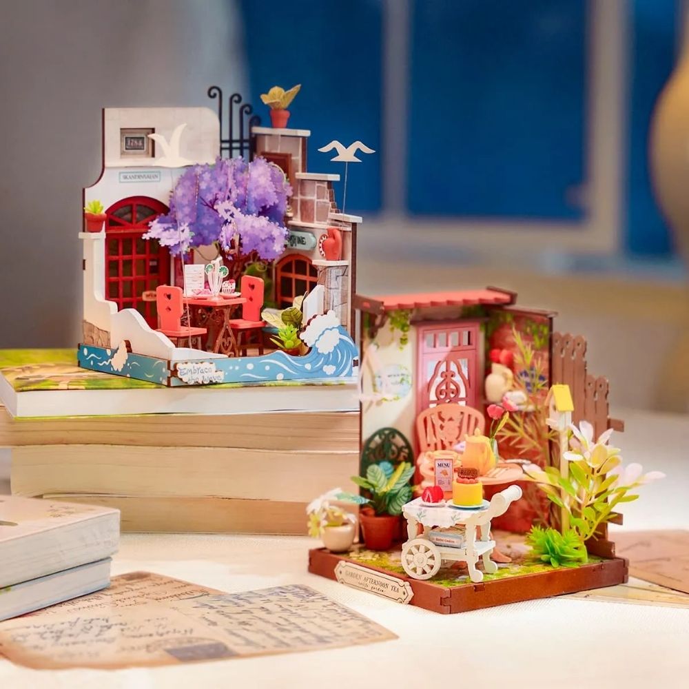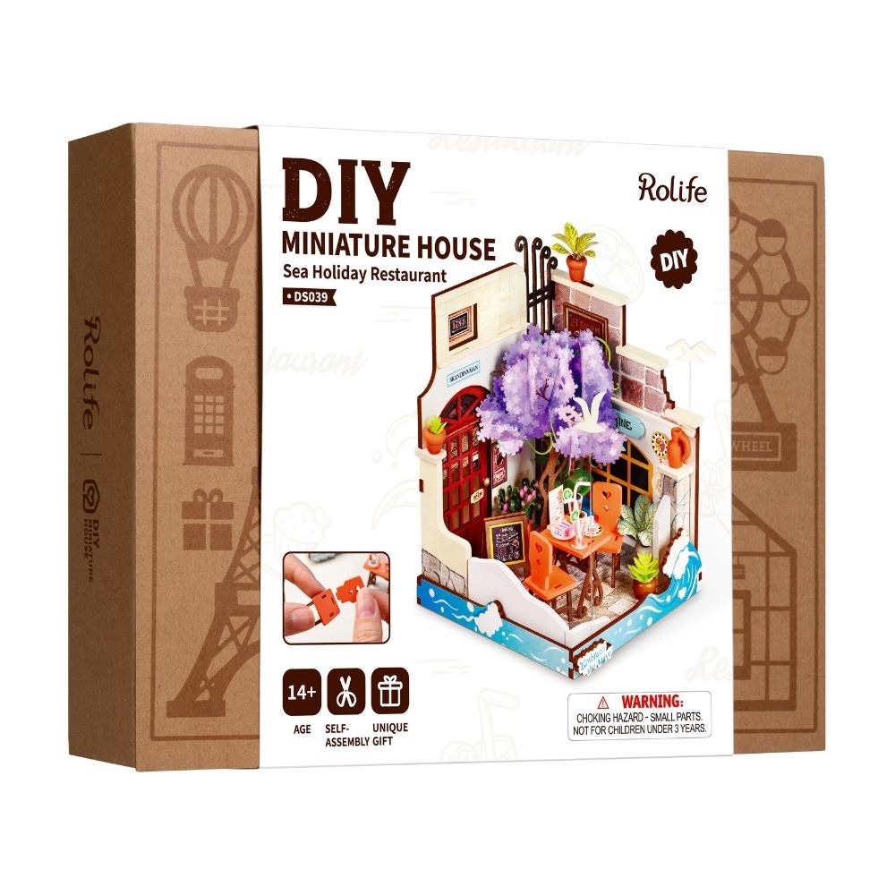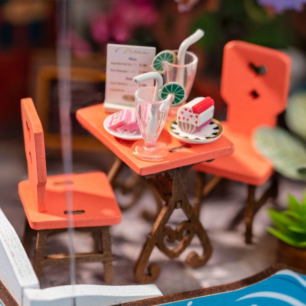 Sumérgete en la atmósfera veraniega de un restaurante junto al mar con este kit de casa miniatura. Este modelo te permite recrear un espacio al aire libre donde los clientes pueden disfrutar de comidas mientras saborean la brisa marina. El interior está amueblado con elementos como una mesa para dos, sillas cómodas, decoraciones marítimas y luces LED, creando un ambiente cálido y acogedor.