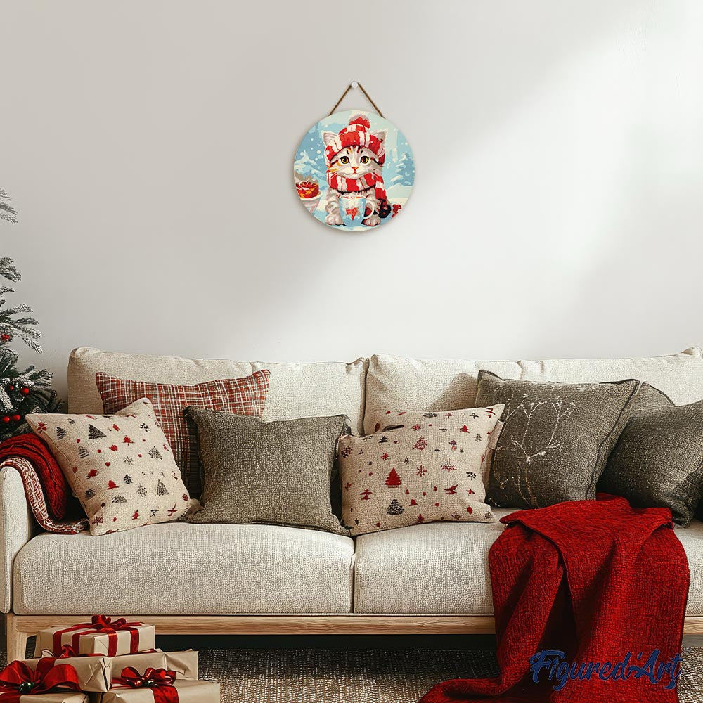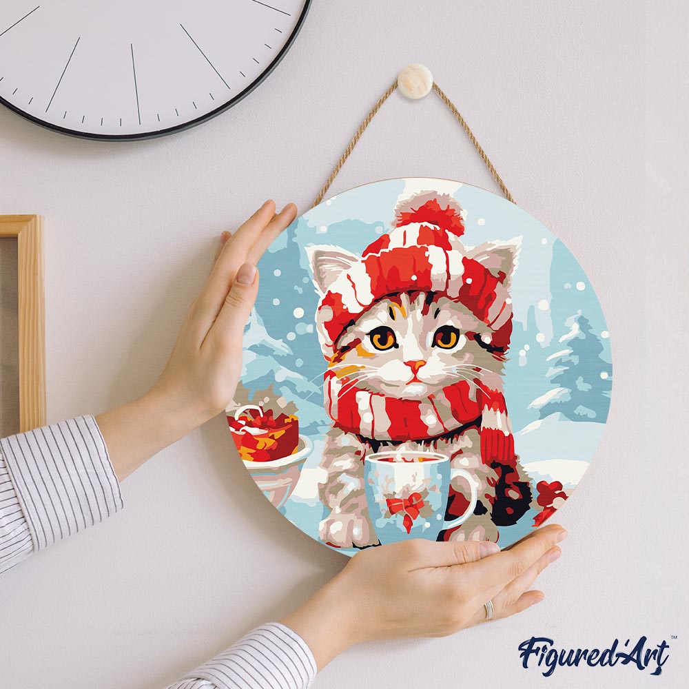 Modelo: Pintar por Números en Disco de Madera - Gato Lindo con Bufanda Roja