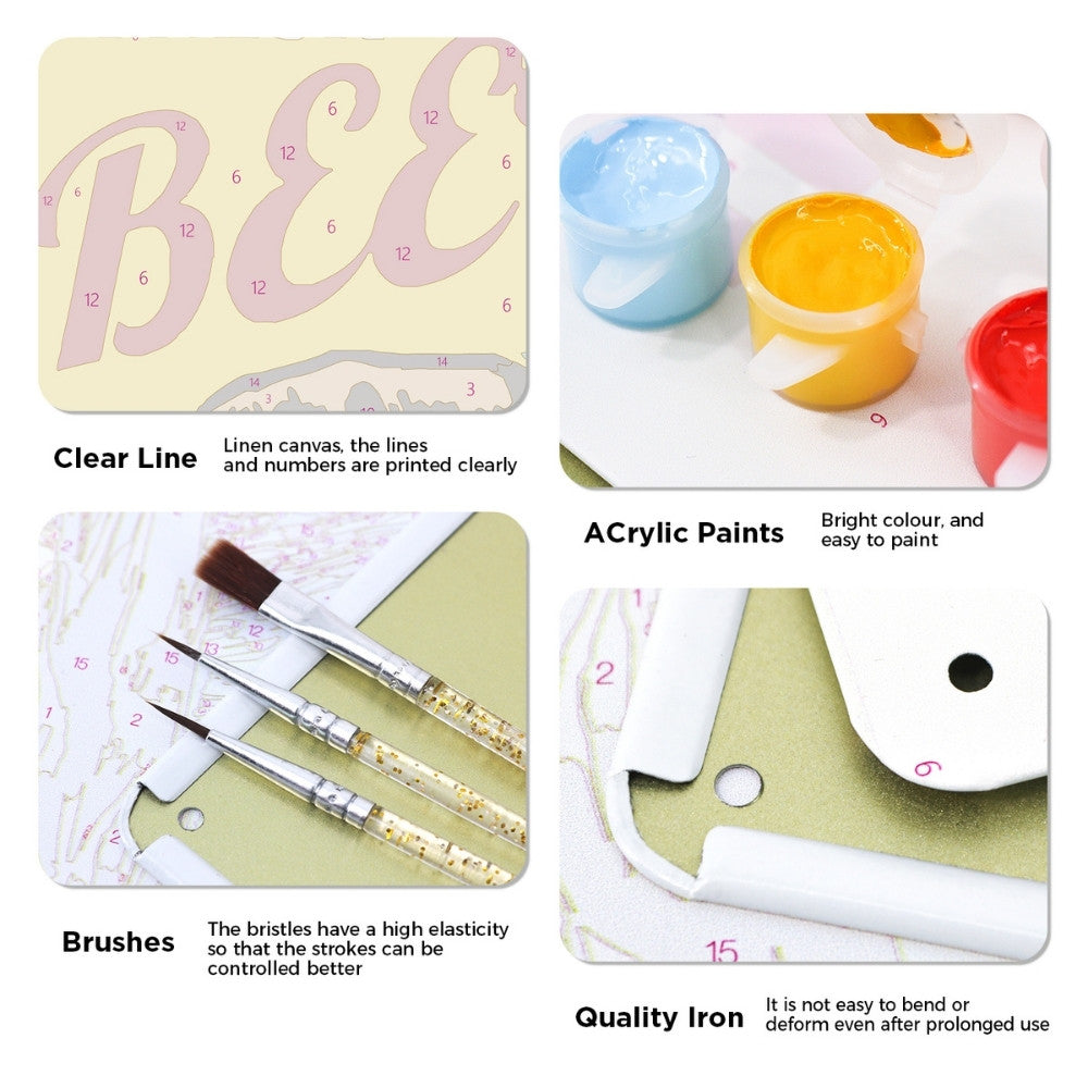 2) Recibirá un kit listo para usar que contiene el lienzo con las áreas numeradas, los potes de pinturas numeradas, pinceles y una imagen del resultado esperado para usar de guía. ¡Que comience el viaje!