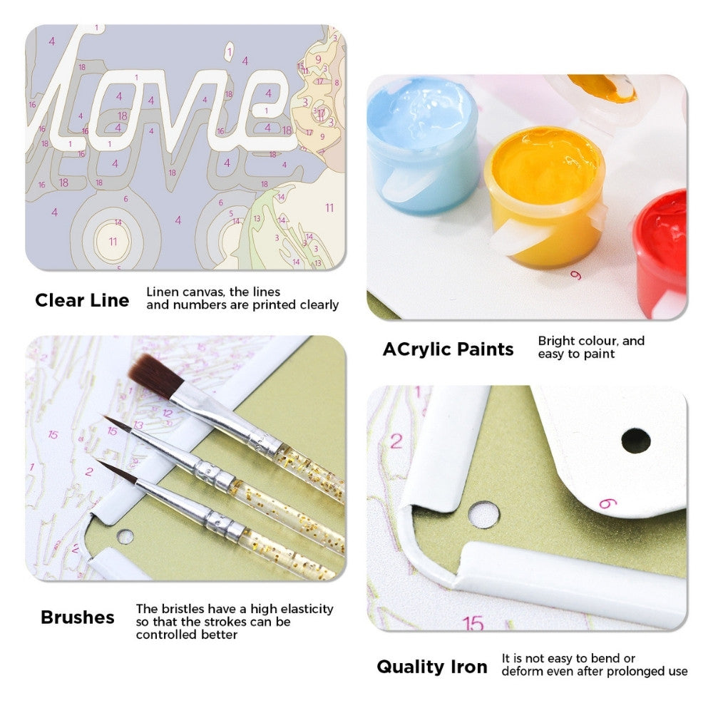 2) Recibirá un kit listo para usar que contiene el lienzo con las áreas numeradas, los potes de pinturas numeradas, pinceles y una imagen del resultado esperado para usar de guía. ¡Que comience el viaje!