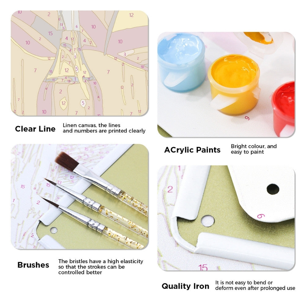 2) Recibirá un kit listo para usar que contiene el lienzo con las áreas numeradas, los potes de pinturas numeradas, pinceles y una imagen del resultado esperado para usar de guía. ¡Que comience el viaje!