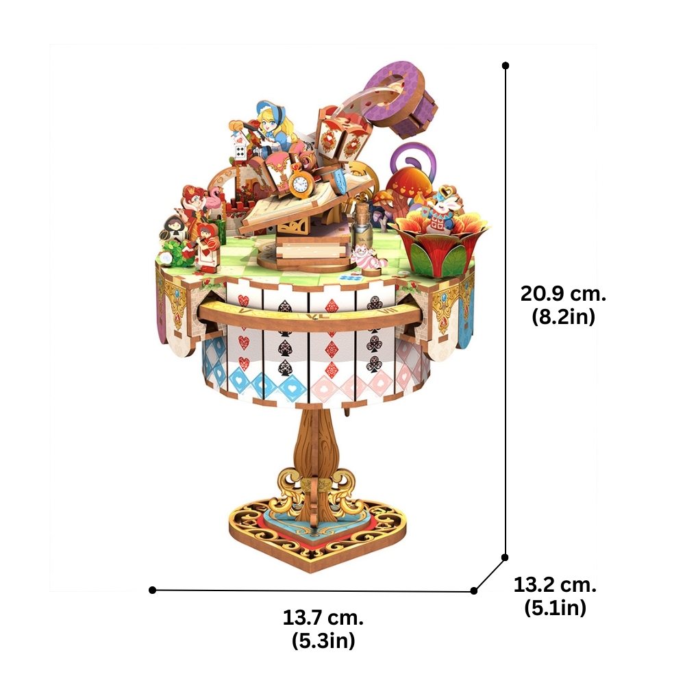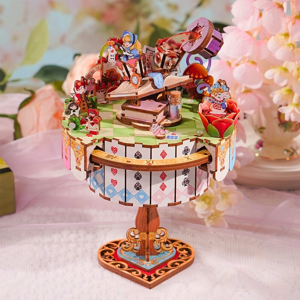 Adéntrate en el maravilloso mundo de Alicia con este puzzle 3D, donde el Gato de Cheshire, el Conejo Blanco y el Sombrero del Sombrerero Loco cobran vida. Descubre relojes, cartas y la Reina de Corazones en detalles mágicos y sorprendentes. Cada pieza convierte el montaje en una aventura fantástica y llena de encanto.