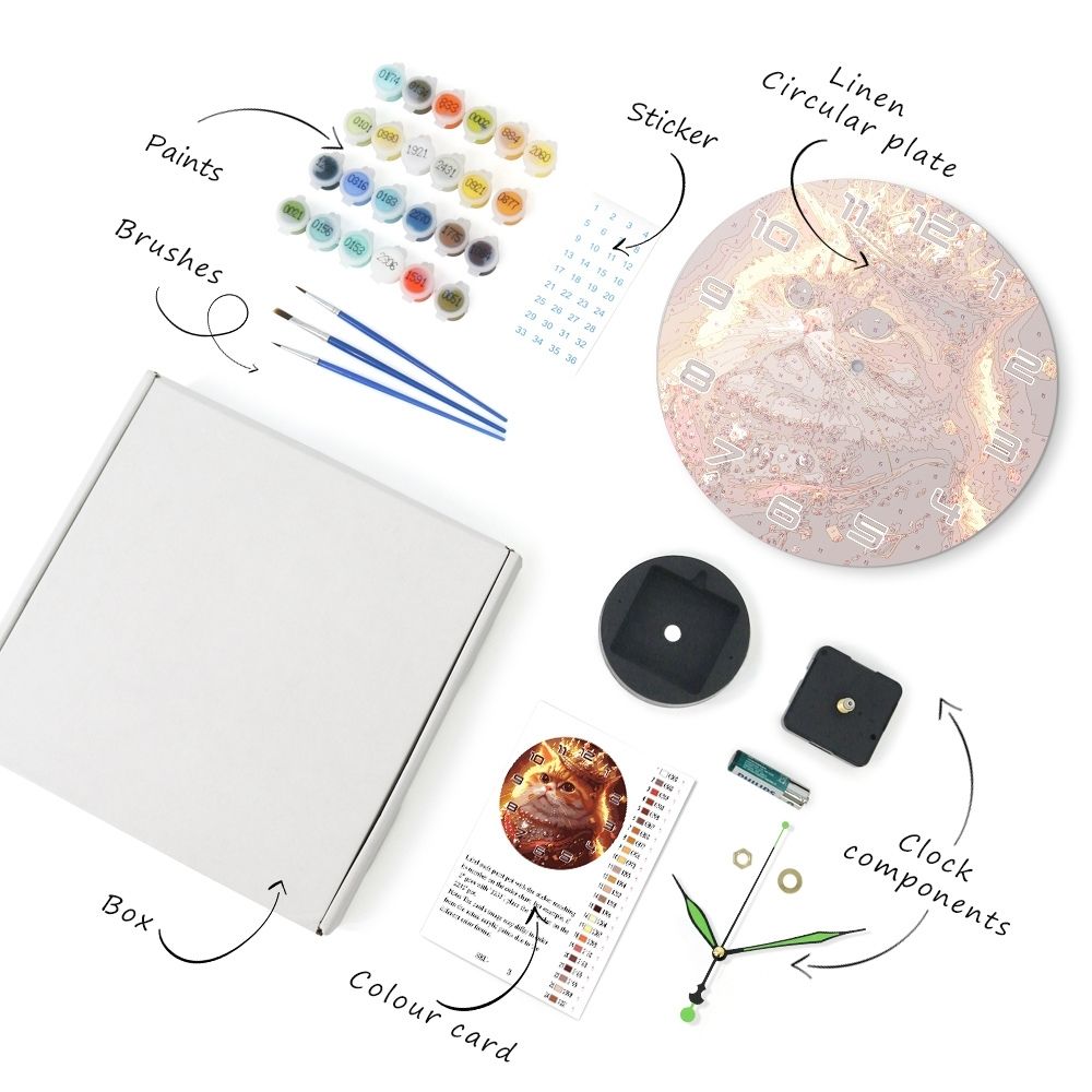 Este kit DIY contiene todo lo necesario para pintar y montar tu propio reloj de pared funcional: