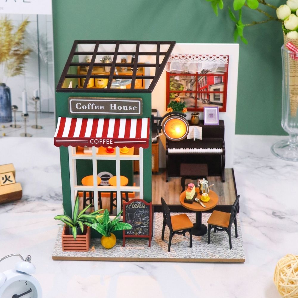 La Casa Miniatura Café de la Tarde captura el encanto de un café acogedor, donde cada detalle crea un espacio acogedor para la relajación y el placer. Desde el toldo rayado del café y el menú en la pizarra hasta el cálido resplandor en el interior, esta escena en miniatura te transporta instantáneamente a una tarde tranquila. El interior presenta un piano pulido, una máquina de café, teteras, pasteles y estantes llenos de delicias, ofreciendo un momento de cuento de hadas congelado en el tiempo.
