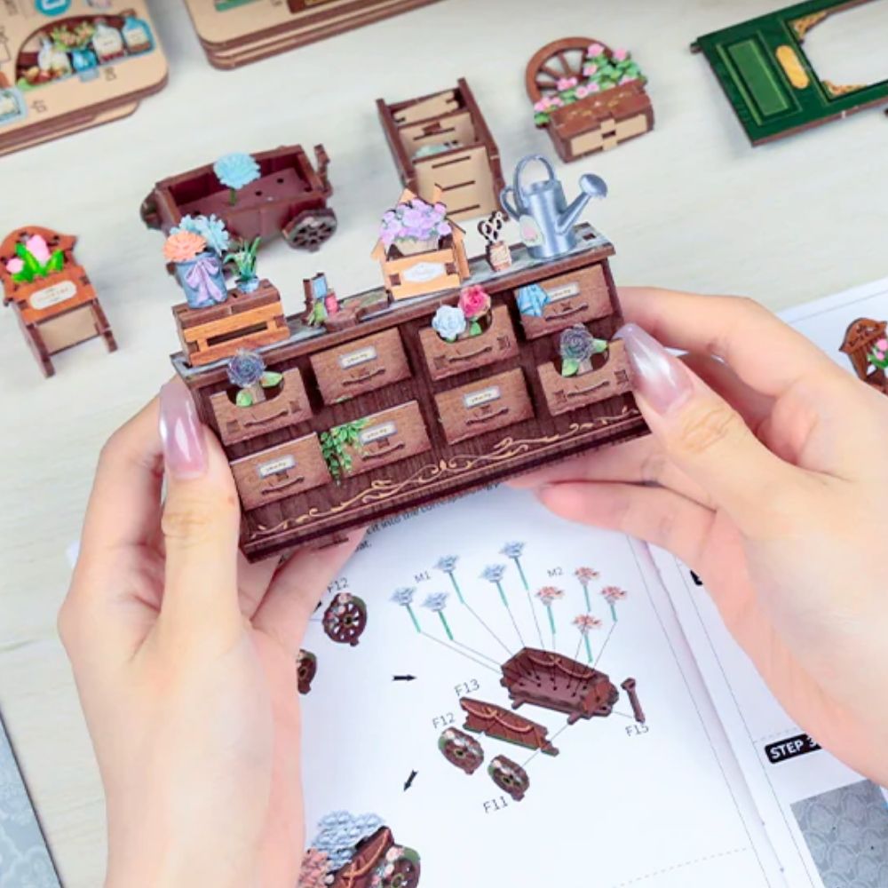 Al abrir el kit, descubrirás todo lo necesario para maqueta de madera sencilla: piezas finamente cortadas, pequeñas decoraciones para ensamblar y detalles de color y textura que te guiarán en la creación de un mundo coherente. Este proceso minucioso pero accesible transforma la actividad creativa en un momento de calma casi meditativo, donde ves nacer poco a poco tu propio pequeño mundo.