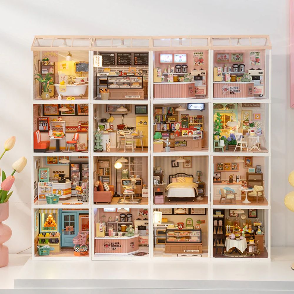 Sumérgete en el ambiente de una animada frutería con este kit de casa miniatura. Este modelo te permite recrear un espacio donde los clientes pueden elegir entre una variedad de frutas frescas, como naranjas, duraznos y uvas. El interior está dispuesto con estantes coloridos, cestas y un carrito, creando una atmósfera vibrante y acogedora.