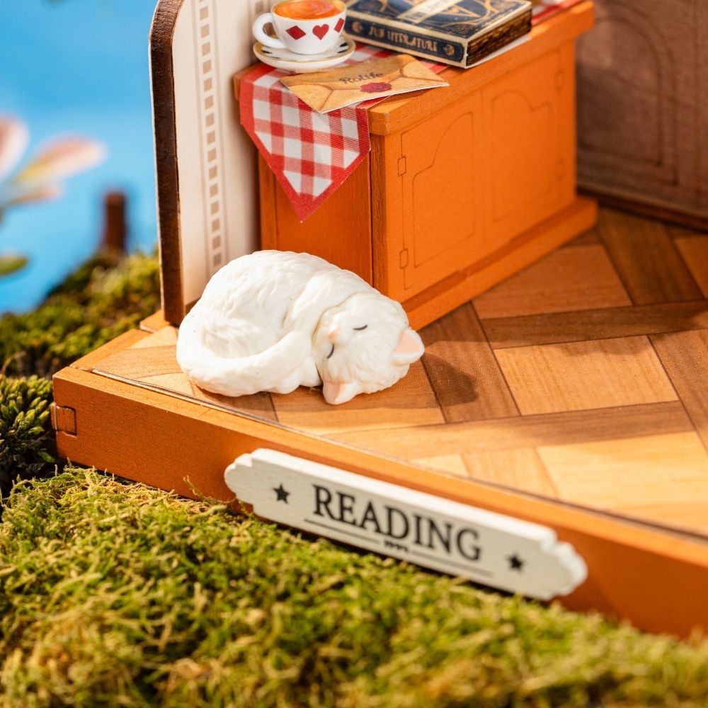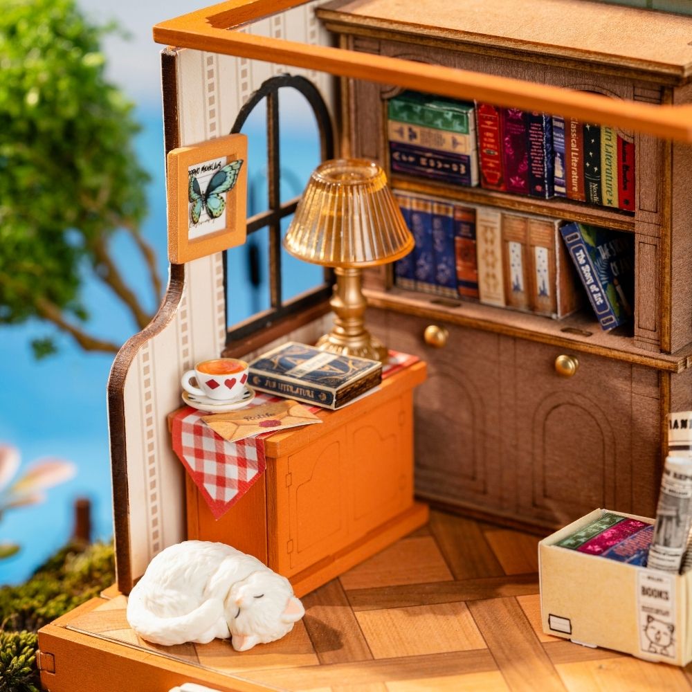 Sumérgete en la acogedora atmósfera de una librería acogedora con este kit de casa en miniatura. Este modelo te permite recrear un espacio donde los libros están ordenadamente dispuestos en estantes de madera, con elementos decorativos como una lámpara de lectura, revistas y cestas, creando un ambiente propicio para la lectura y la relajación.