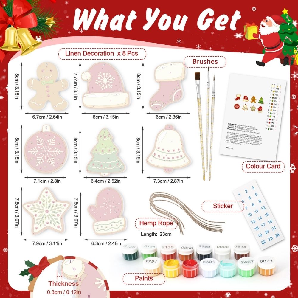 - 8 decoraciones de madera precortadas (guantes y sombreros) con guías numeradas impresas