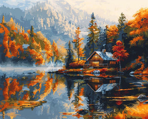 Modelo : Cabaña junto al lago en otoño