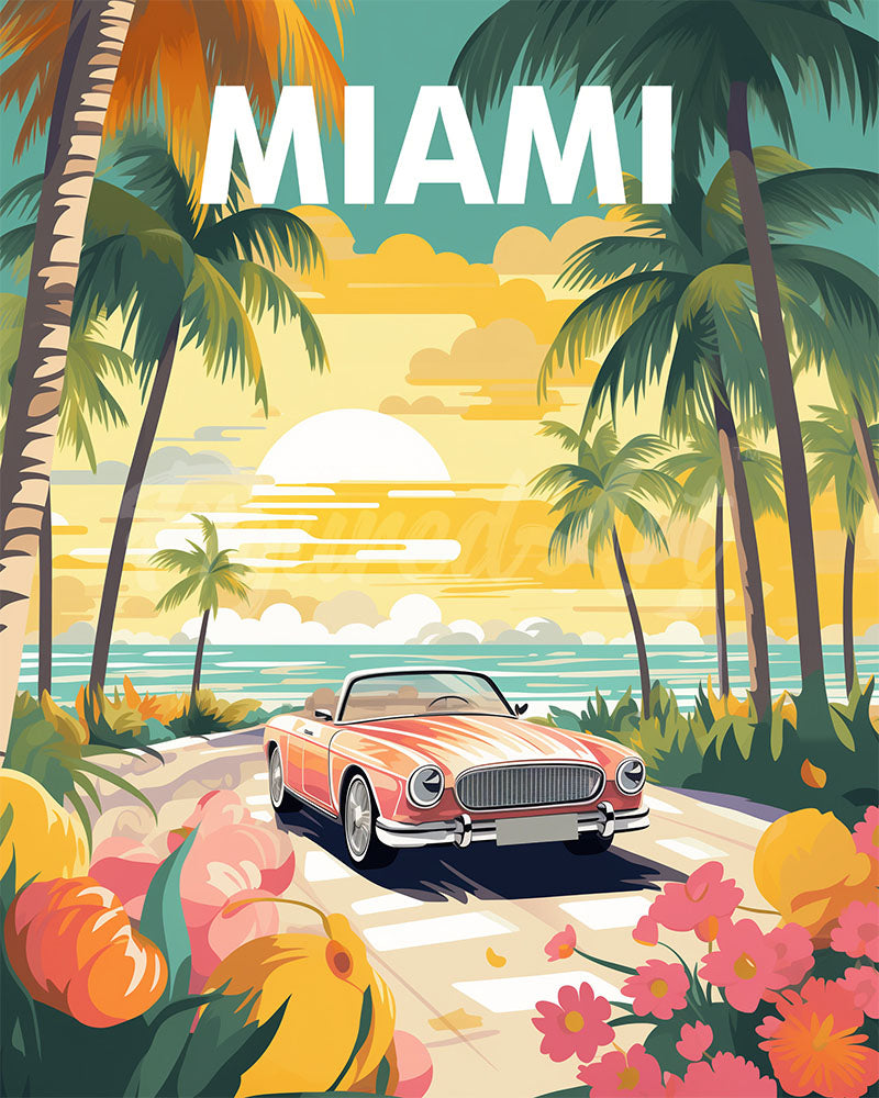 Diamond Painting - Póster de viaje atardecer en Miami 40x50cm con bastidor montado