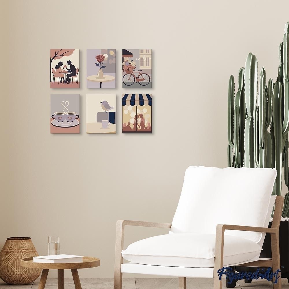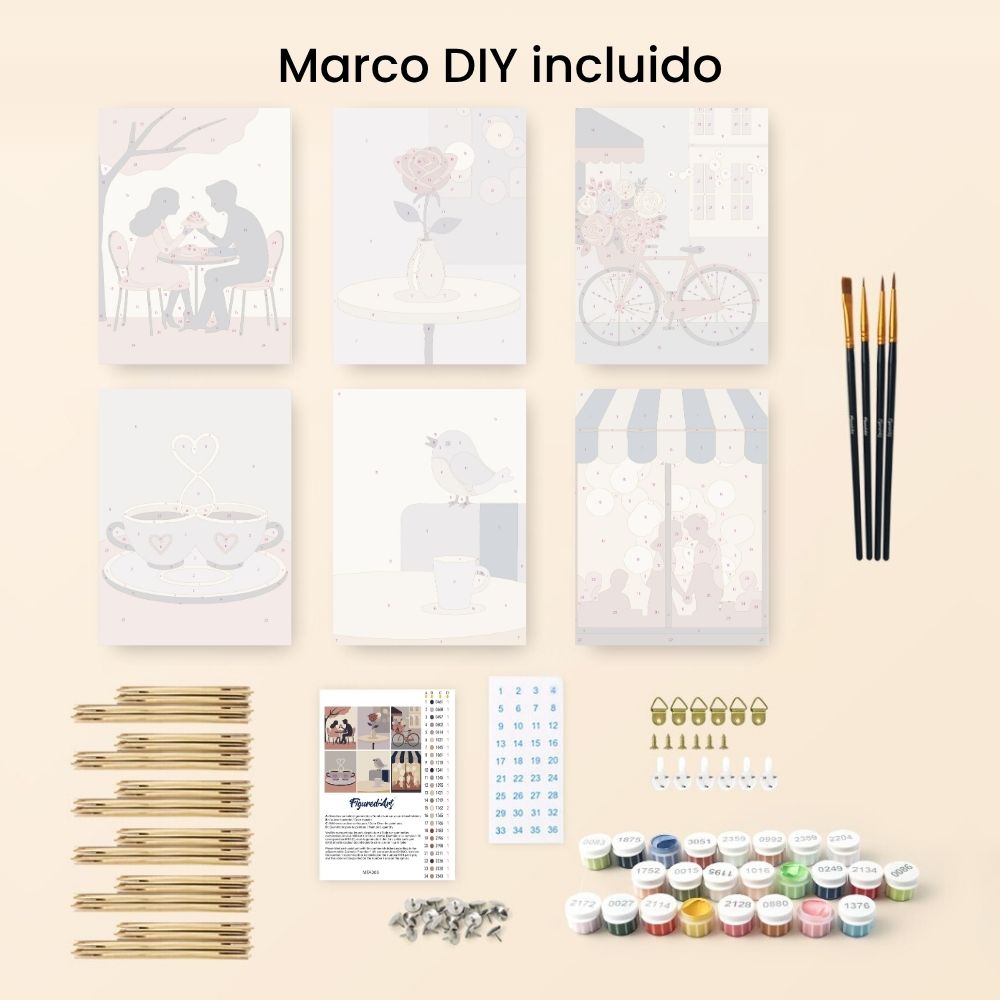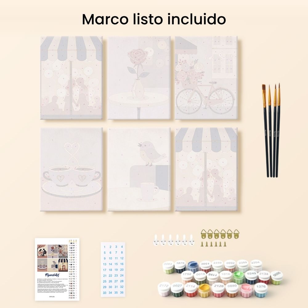 El set Romance en el Café presenta seis diseños de pintar con números que capturan la esencia de una cita romántica en la ciudad. Escenas suaves de cafés compartidos, palabras de amor susurradas, rosas rojas y paseos en bicicleta se combinan en una paleta dulce y soñadora. Cada lienzo evoca ternura y conexión, transformando momentos cotidianos en expresiones atemporales de afecto.