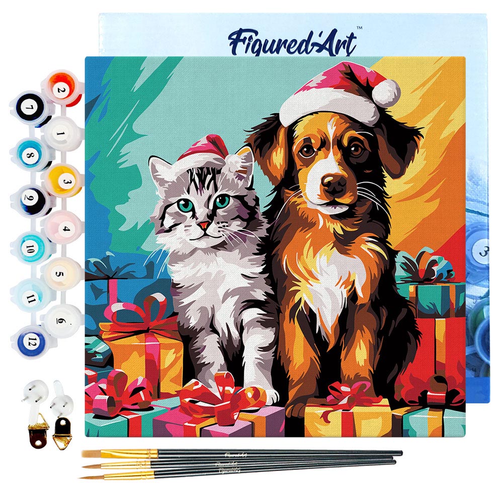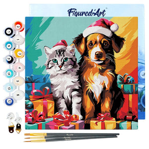 Modelo: Mini Pintura por Números 20x20cm con bastidor - Gato y perro festivos
