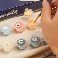 2) Recibirá un kit listo para usar que contiene el lienzo con las áreas numeradas, los potes de pinturas numeradas, pinceles y una imagen del resultado esperado para usar de guía. ¡Que comience el viaje!