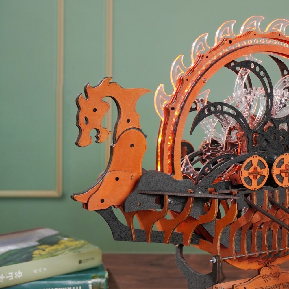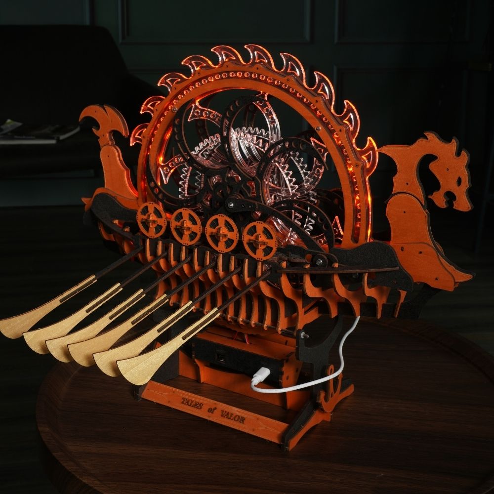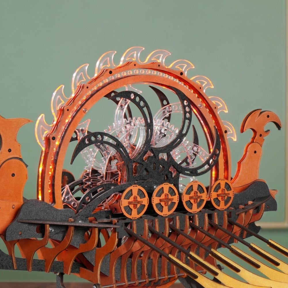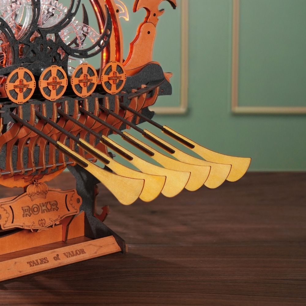 - Estructura Mecánica Avanzada: El modelo está diseñado con una estructura mecánica avanzada, incluyendo elementos móviles como la cabeza y cola del dragón, remos y vela, activados por un mecanismo de manivela.